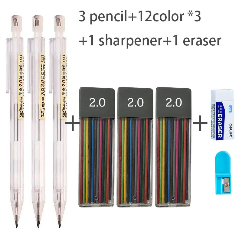 2.0 Retractable Mechanical Metal Plastic Pencil Colored Black 2mm Refill 2B Lead for Sketch Drawing School Drawing Pencil